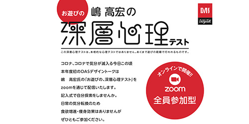 コロナ、コロナで気分が滅入る今日この頃 本年度初のDASデザイントークは 嶋 高宏氏の「お遊びの、深層心理テスト」を zoomを通じて配信いたします。 記入式で自分探索をしませんか。 日常の気分転換のため 食欲増進・痩身効果はありませんが