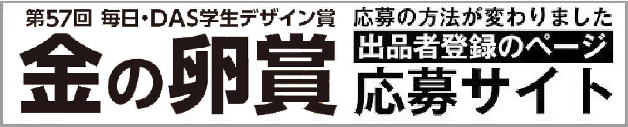投稿日: 2026年2月2日2026年2月2日第57回 毎日・DAS学生デザイン賞 金の卵賞 大学生の部 作品募集開始しました。詳しくは下記をクリック、アクセスしてご覧ください。 登録・応募は↑ここをクリック
