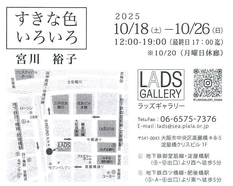 すきな色 いろいろ/Space Expand Kháos 投稿日: 2025年9月30日2025年10月1日 投稿者: das 会員の宮川憲明さんと宮川裕子さん同時開催の展覧会のお知らせです。 宮川 裕子:すきな色 いろいろ Space Expand Kháos:宮川 憲明 日時:2025年10月18日(土)~26日(日) 12:00~19:00(最終17:00迄) 場所:LADS GALLERY ラッズギャラリー https://www.ladsgallery.com これからの展覧会 https://ladsgallery.com/exhibitions/upcoming.html No related posts.